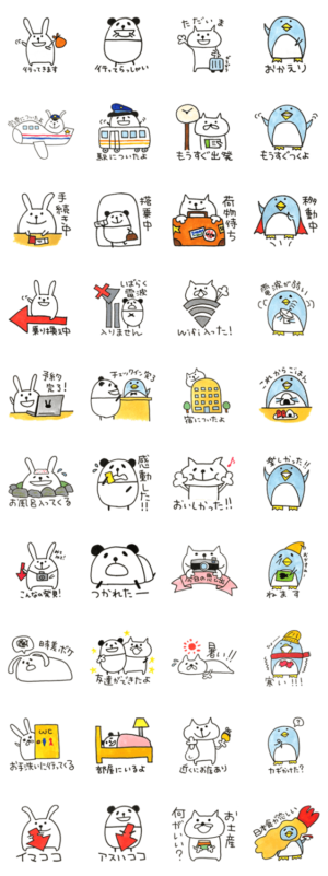 国内・海外旅行や、出張に使えるスタンプ!ちょっとしたお出かけや、日常生活にもどうぞ。旅行中に家族や友達、恋人と使ったり、お留守番をしている方にも送れます。あわじカット より発売