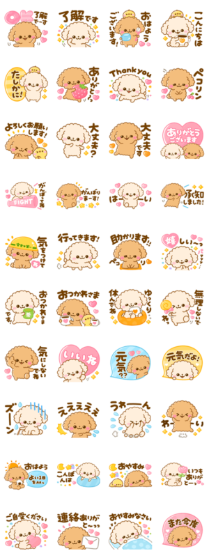 トイプードルのモカちゃんラテくんの見やすいデカ文字スタンプです♪適度に敬語も入った毎日使える内容です♡ぴよたぬき♡ より発売