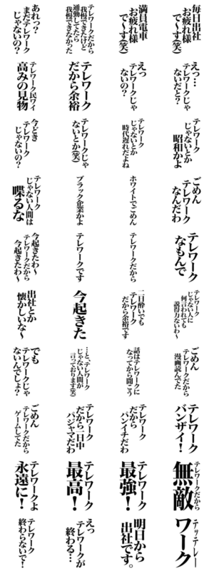 えっ?勿論テレワークだよね?w出勤とかしてないよねw えっ…出社してるの?昭和かよ 【あざとい.ゆるっと.休む.冗談.笑い.返信.ネタ.面白.漢字.文字.休日.応援】 ※このスタンプはトークルームで大きく表示されるBIGスタンプです。チェケジ より発売