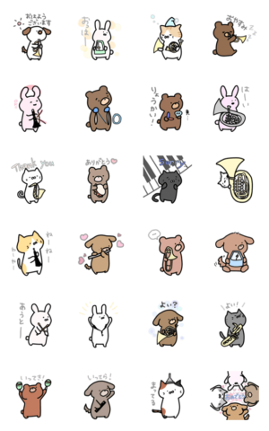 吹奏楽で使われるトランペット、ホルン、クラリネット、サックス、フルートなどを持ったかわいいいぬやねこ、くま、うさぎさんのスタンプ第2弾!