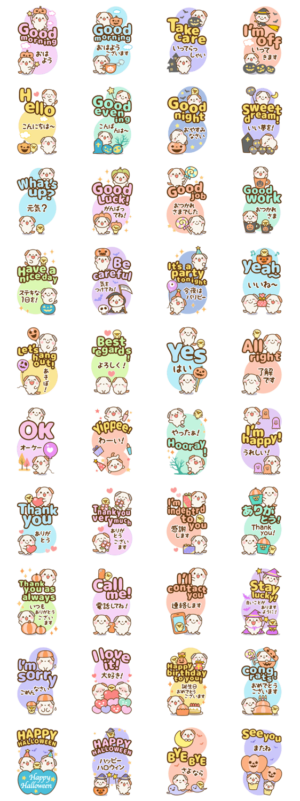 たれ耳ワンコのハロウィン・BIGスタンプです♪ 日常にも使える挨拶やメッセージを盛り込みました♫「英語&日本語」でバイリンガルに会話を楽しんでくださいね〜♬ ※このスタンプはトークルームで大きく表示されるBIGスタンプです。プリン より発売