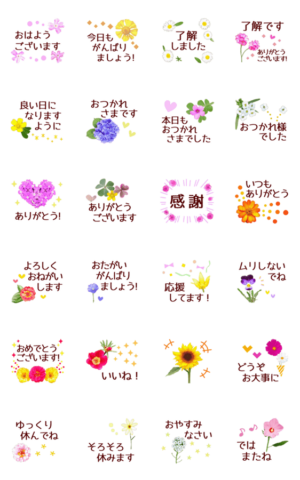 相手を選ばない日常づかいに便利な植物スタンプです。よく使う思いやりの言葉と敬語が多め。落ち着いた大人の方にも送りやすいです。春夏秋冬いつでもずっと使えるセットjabo より発売