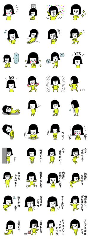毎日頑張って働く女性の方へ、ビジネスシーンや職場の人へ使えるシンプルな敬語のスタンプです。なぜか黄色の全身タイツのちょいシュールな風貌のOLが気持ちを伝えます。panda-chocolate より発売