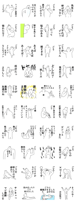 ごうくん(君)が使えるスタンプです。シュールで面白いバージョンです。ゴウ、剛、豪、郷、強、ごうた、ごうし、ごうき、ごうすけ、ごうしんなど。