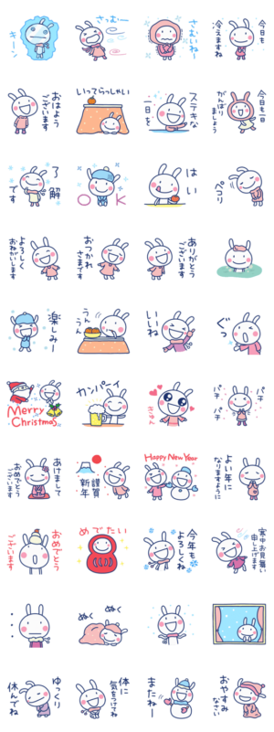 「さむいねー」から「ぬくぬく」まで。寒い冬をほぼ白うさぎと楽しく乗り切ろう。クリスマス、年末年始、お正月、バレンタイン。冬の季節に使いやすいシンプル言葉集です。Mami / エストループ より発売