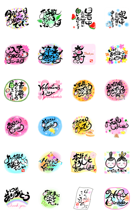 季節の挨拶スタンプを、筆ペンでおしゃれに書いてみました。可愛いデカ文字で便利。年末年始、入学卒業、結婚出産、寒中暑中見舞い、バレンタインなど。世界一ピエロ より発売
