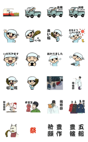 米農家の男性と、稲作に関する神社の祭事のスタンプです。さくさく より発売