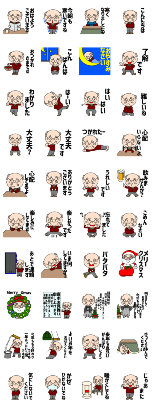 のんびりおじいちゃんの冬に使いやすい言葉です。クリスマスやお正月に使える言葉もあります。便利に使って下さいね。ゆずっ子 より発売