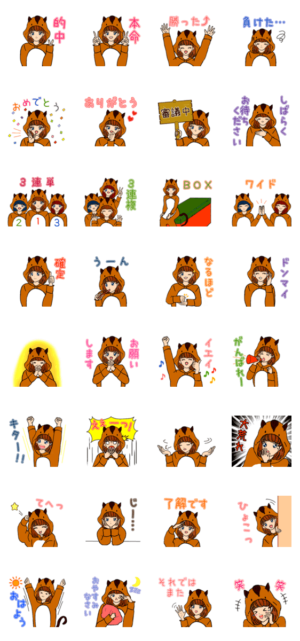 おウマさんの着ぐるみを着た女の子(娘)のスタンプです。競馬仲間とトークを楽しみましょう。よく使う日常会話もあります。yoka-yoka より発売