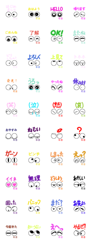 かわいい目玉の日常会話・あいさつ・気持ち 了解 はじめまして おはよう HELLO 帰ります ごめんね またね どうしたの? よろしく 上見て OK トホホ 今起きた