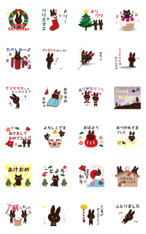 黒うさぎと黒ねこがクリスマスとお正月の挨拶をしてくれる動くスタンプ、かわいくて喜ばれそう!