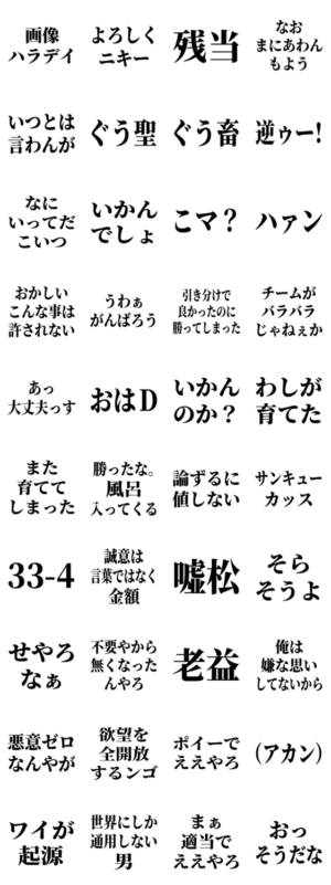 【ネタ/煽り/どや顔/面白い/シンプル/愛/返信/便利/使いやすい/なんJ/友達/言い訳/流行り/関西弁/野球/あるある/おじさん/オッサン/日本人/社会人/野球/やきう/ネット】