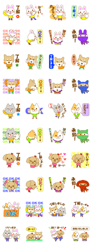 可愛い動物イラストの了解、OK、おまかせくださいスタンプです。いろんなOK、了解、承知、かしこまり、はぁい、お任せくださいとオールオッケーの便利なスタンプ。