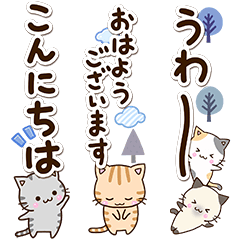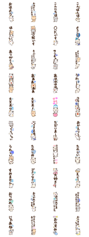 『おちゃめなネコたち』の縦に長い猫スタンプ。シャム猫、三毛猫、トラねこ等が登場するスタンプ。タテに長いので目立ちます。しゃむねこ、サバトラ等の猫好きの方にぜひ。