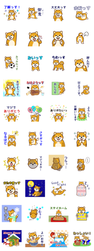 特に男子や男性におすすめしたいスタンプの柴犬編。もちろん女性も使えます。 あざっす/おいっす/ちわっす/御意/了解/クリスマス/年越し/正月/わっしょい/年末年始