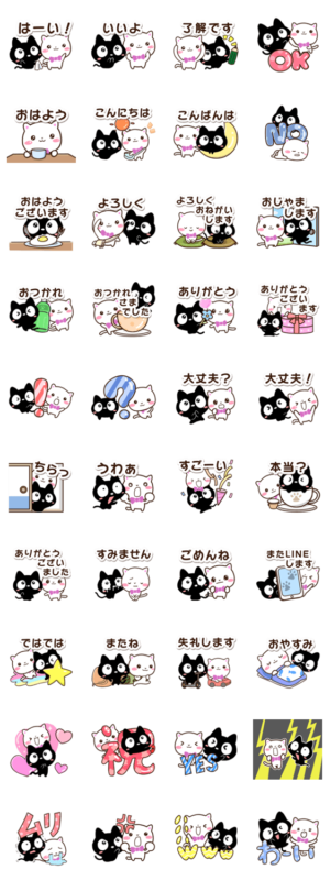 『クロネコすたんぷ』と『シロネコすたんぷ』の通常スタンプです。基本的なあいさつや、毎日便利に使える言葉を集めました。黒ねこ、白猫好きな方にぜひ。【かたこ】