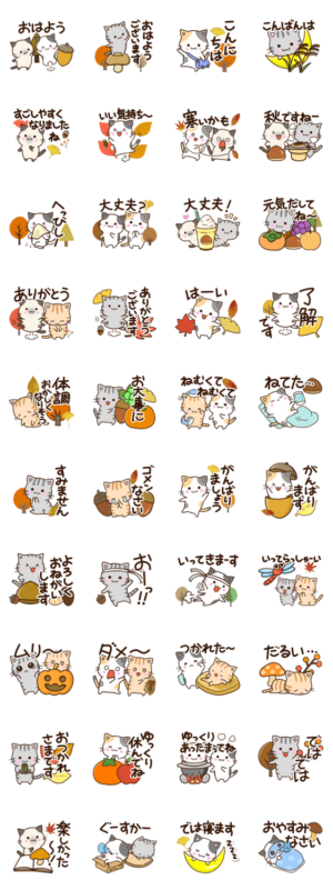 『おちゃめなネコたち』の秋に使える猫スタンプ。シャム猫、三毛猫、トラねこ等が登場するスタンプ。にぎやかです。しゃむねこ、サバトラ等の猫好きの方にぜひ。かたこ より発売