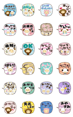 きぐるみ団♪が吹き出しから元気に飛び出す!毎日使えるご挨拶のポップアップスタンプです♪