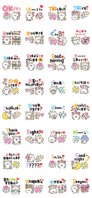 ♡が多めでかわいい。文字も多いし使いやすいです!いろんな場面で使えそう