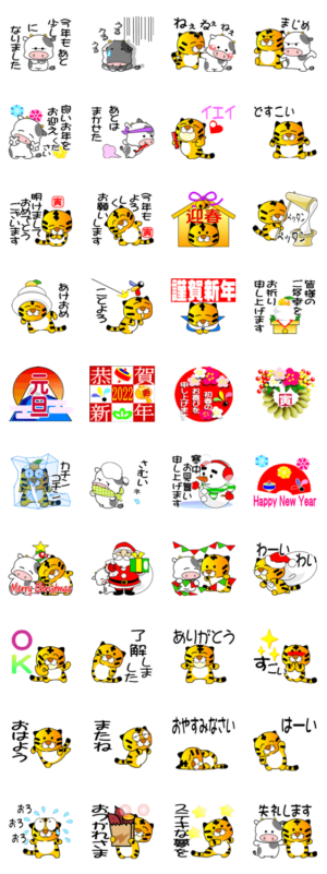 トラの子供のコトラちゃんと牛の子供のモーちゃんの楽しい冬のスタンプです。ohausa より発売