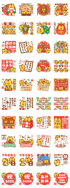 新年の挨拶/あけましておめでとう/今年もよろしく/正月スタンプ/謹賀新年/元旦/虎/トラ/年賀状/お年玉/大晦日/年越し/よいお年を/除夜の鐘/帰省中/初詣/金文字/年末年始じゃむばたチーズ より発売