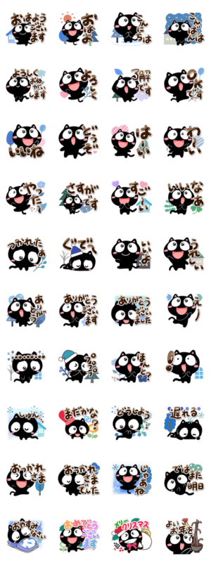 【くろちー】の黒猫スタンプの【冬編】です。よく使う言葉に、雪や冬等の飾りを加えクリスマスと年末のあいさつも加えたネコスタンプ。クロねこ好きな方にぜひ。【かたこ】かたこ より発売