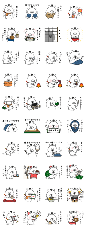 ゆるうさぎの武士語風スタンプの冬ver. 家族や友達、彼氏彼女、先輩後輩、ママ友との日常トークに。クリスマス、年末、お正月、年賀状、節分、バレンタインにも使えます。chococo より発売