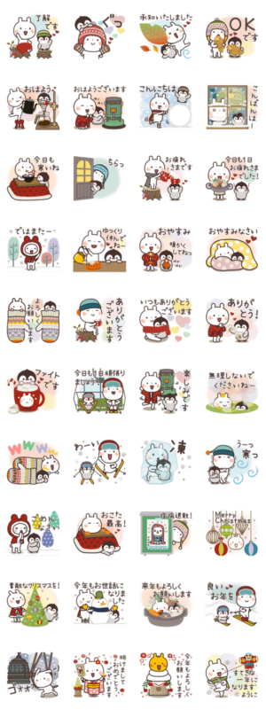 大人可愛いうさぎとゆるぺんの日常でよく使う言葉を集めたスタンプです。敬語多めの冬バージョンです。クリスマスや年末年始にも使えるよ♪mamako より発売