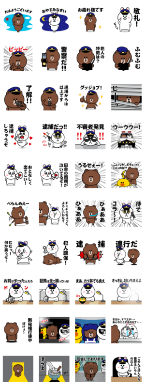 ブラウン/コニー/サリー/ムーン/LINEキャラクターズ/警察/警官/ポリス/刑事/お巡りさん/交番/取り調べ/逮捕/パトカー/手錠/毎日使える/挨拶/便利/ ※BROWN & FRIENDS をみんなでつくろう!キャンペーン参加スタンプです4A-Studio(よんえーすたじお) より発売