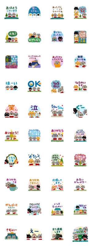 ちびねこイッパイの冬スタンプです。 日常会話に使いやすい言葉いろいろ、敬語も入っています。KAKKOBOX より発売