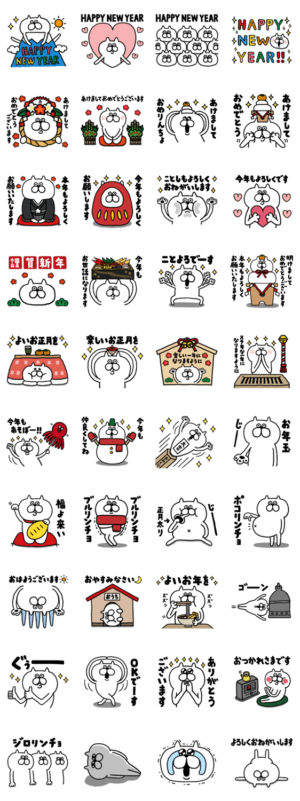 ゆるいネコのスタンプです。年末年始、お正月、新年の挨拶などにお使いください。green peas より発売