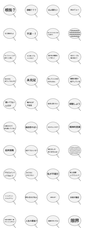 もう実習無理すぎて帰りたいしやりたくないし課題とかわけわからないし、つらいし寝たいし無理すぎる看護学生向けスタンプだけど社畜に通じるものがある。しろ より発売