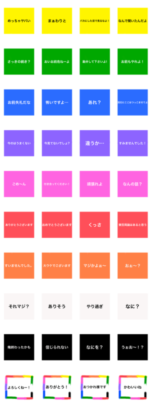 よく使える日常的な言葉を集めました。色が豊富なのでその日の気分に合わせて使える!シンプルで使いやすいスタンプです!ジャンボ文字で皆様のニーズに合わせて日々制作中