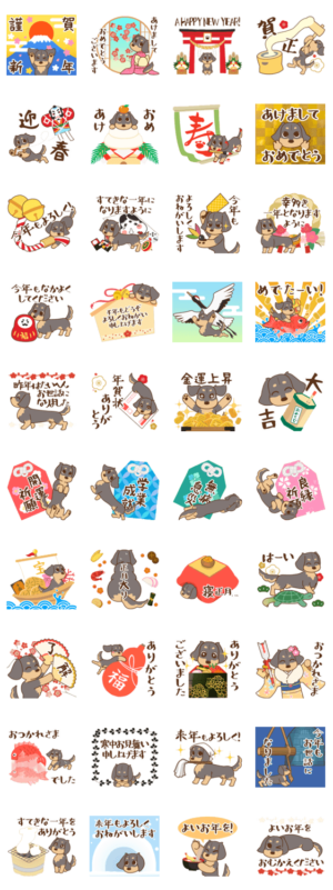 【再販】ダックスフンドのほんわか可愛いお正月スタンプです! 大晦日や新年のあいさつなど年末年始に存分に使えます。 日常会話から敬語も含みとても便利ですよ♪Studio1010 より発売