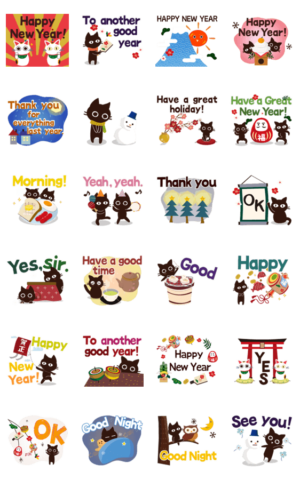 毎年使える!飛び出す!ナチュラルで絵本のようなねこのスタンプ3年末年始:英語Ver。和風で女子力高めな大人可愛い女子向け。門松,招き猫,雪だるまmugiko より発売