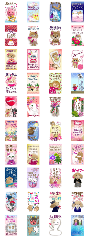 凄い癒される素敵なスタンプです。ネコと犬の可愛さもさることながら、しゃべるモチの可愛さも半端ないですね。