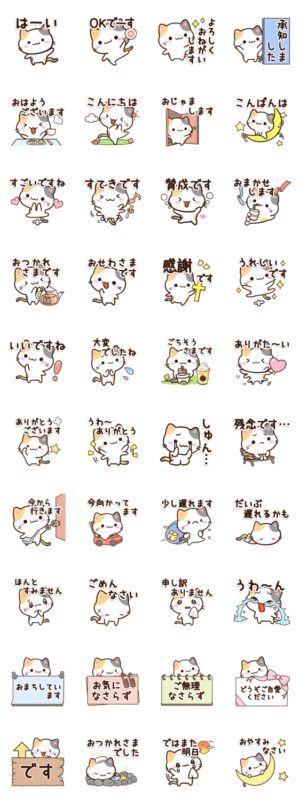 『小さい三毛猫』スタンプから、毎日使える丁寧な言葉や、敬語のミケネコスタンプです。ミケねこ好きな方にぜひ。【かたこ】かたこ より発売