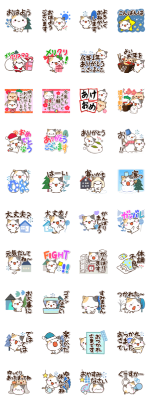 よく使う言葉に雪や冬等の飾りを加えたネコスタンプです。クリスマスと年末年始のあいさつも合わせた三毛猫スタンプ。みけねこ好きな方にぜひ。【かたこ】かたこ より発売