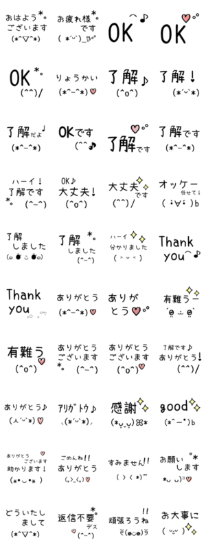 ありがとう/OK/了解/よく使う/毎日使える/敬語/気持ち伝わる/シンプル/大人可愛い/顔文字/顔/表情/友達/彼氏/ママ/ママ友/ハート/あいさつ