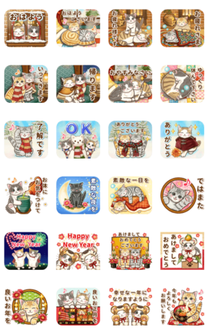 やさしい猫の冬&年末年始のポップアップスタンプです♪冬に使いやすい言葉から年末年始の挨拶までたくさん♫寒い冬もやさしい猫たちがあたたかい気持ちをお届けいたします☆ちょびくろ より発売
