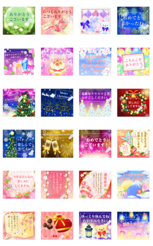 おしゃれで彩り鮮やかな大人向けのグリーティングカード風。 キラキラで派手目でお祝いにもぴったり。クリスマス、お正月、年末年始、誕生日、バレンタインに。 現在この商品は一部のスマートフォン版LINE 10.3.0以上のトークルームでのみ使用できます。動作環境の最新情報はヘルプをご確認ください。ウォームスクリエイト より発売