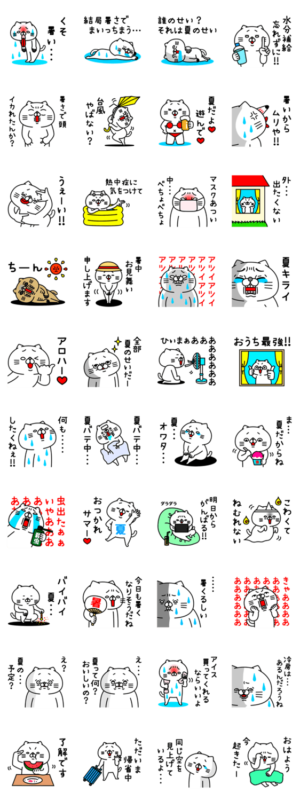 夏が苦手なネコさんがなんとも可愛らしいスタンプです。このスタンプで夏の暑さを伝えましょう。