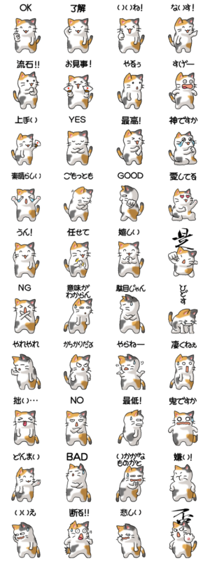 前半が肯定、後半が否定です。このスタンプは猫大好き! (大)その27「肯定と否定」白の色違いです。