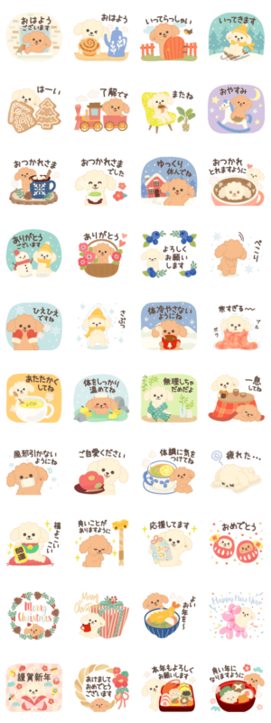 甘さ控えめ大人かわいいふわもこのトイプードル♪毎日のあいさつに使えるシンプルな犬スタンプ。冬の気づかい言葉から敬語・挨拶・お仕事にも。クリスマス、年末年始あり。