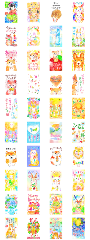 明るくきれいな水彩の動物たちがいっぱい♪ありがとう・感謝の気持ち多めなポストカード風BIGスタンプ・シリーズ3です。 寅年の年賀状・クリスマスカードも入っています。 ※このスタンプはトークルームで大きく表示されるBIGスタンプです。ようこ より発売