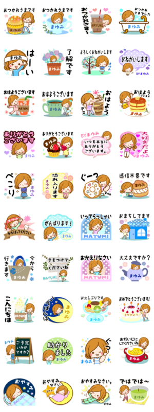 全国の「まゆみ」さんが使う専用スタンプ第2弾です☆使いやすい言葉を厳選した、大人向けの落ち着いたスタンプです☆「ほのぼのカノジョ」作者ルルーの名前スタンプ