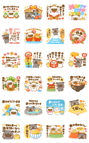 フォーンパグちゃん♪黒パグちゃんが仲良く飛び出して新年のご挨拶♡年末年始にずっと使えるあいさつスタンプです♡ぴよたぬき♡ より発売