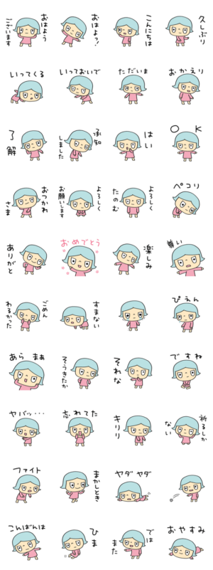 ちょっと目つきの悪い女の子オリプル。挨拶編。「こんにちは」「いってくる」から「おやすみ」まで。日常で使いやすいあいさつ言葉がいっぱい。家族、学校、お仕事でも。