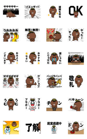 ブラウン/コニー/ムーン/サリー/LINEキャラクターズ/毎日使える/日常会話/挨拶/軍人/軍隊/自衛隊/陸軍/海軍/空軍/サバゲー/エージェント/ミリタリー/アーミー/軍曹/大佐 ※BROWN & FRIENDS をみんなでつくろう!キャンペーン参加スタンプです4A-Studio(よんえーすたじお) より発売