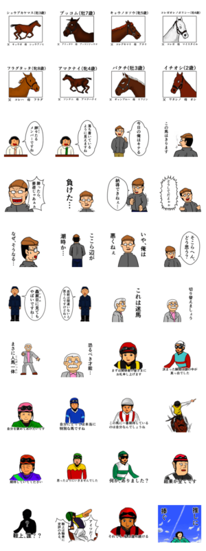 遂にラッキー7!今まで出てきた人達に加えて騎手っぽいスタンプを収録。40番目のスタンプは「飛行機雲」です。※実在の競走馬、関係者等とは一切関係がありません。